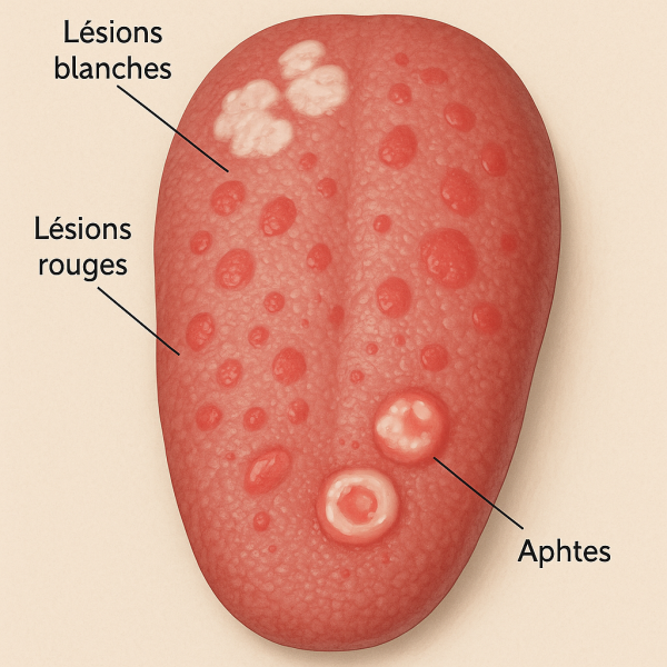 Les aphtes sont des lésions douloureuses, généralement rondes et blanchâtres, qui apparaissent à l'intérieur de la bouche, y compris sur la langue. Ils peuvent être causés par le stress, des carences nutritionnelles, ou même des facteurs héréditaires. Il est important de distinguer ces ulcérations des autres anomalies linguales pour une gestion appropriée.