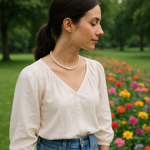 Pour un look quotidien décontracté, il est possible de marier un collier ras de cou en perles avec une blouse en coton, un jean taille haute et des baskets blanches. Cela crée un contraste élégant entre le chic des perles et la simplicité du casual.
