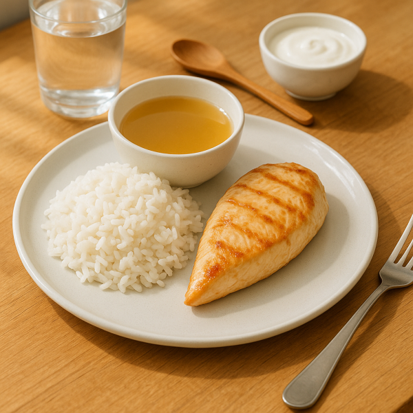 - Déjeuner : Filet de poulet grillé avec du riz blanc et un bouillon de légumes filtré.