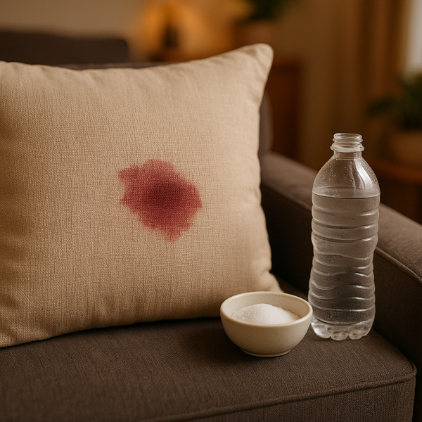 Eau froide et sel : Tamponnez la tache avec un linge propre pour absorber le vin, puis saupoudrez de sel. Laissez agir quelques minutes avant de rincer à l'eau froide.